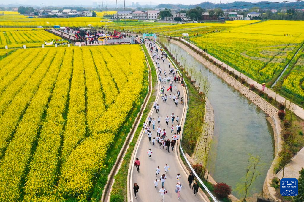 2024年3月22日,瀏陽(yáng)市永安鎮(zhèn)豐裕村舉辦的油菜花節(jié),村民和游客參加花田鄉(xiāng)野跑活動(dòng)(無人機(jī)照片)。新華社發(fā)