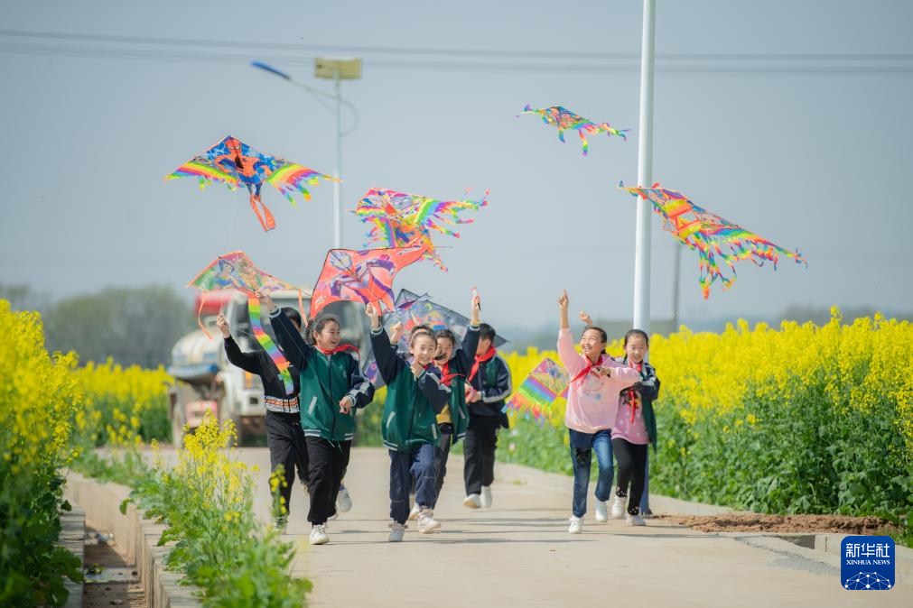 2023年3月10日,孩子們?cè)跒g陽(yáng)市永安鎮(zhèn)豐裕村放風(fēng)箏。新華社發(fā)