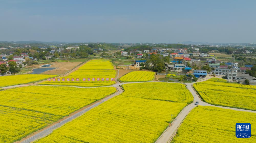 這是2023年3月10日拍攝的瀏陽(yáng)市永安鎮(zhèn)豐裕村改良后耕地上的油菜花(無人機(jī)照片)。新華社發(fā)