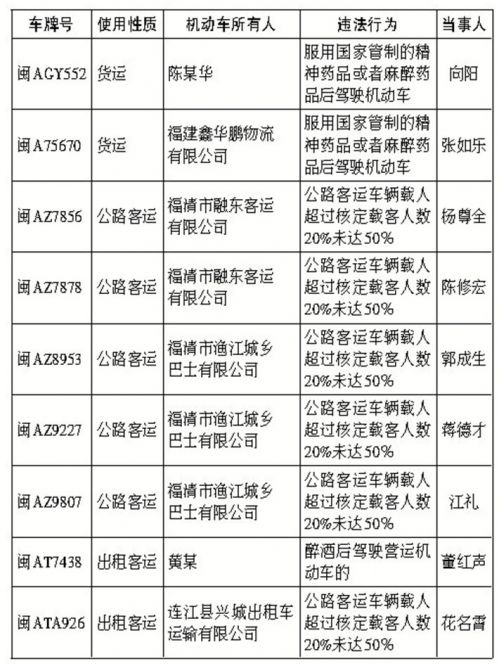 昨日,交警部門還公布了第一季度9起重點駕駛人嚴重交通違法名單。其中2起服用國家管制的精神藥品或者麻醉藥品后駕駛機動車;6起公路客運車輛載人超過核定載客人數20%未達50%;還有1起為醉酒后駕駛營運機動車(具體名單詳見表二)。(記者 林春長 通訊員榕交警)