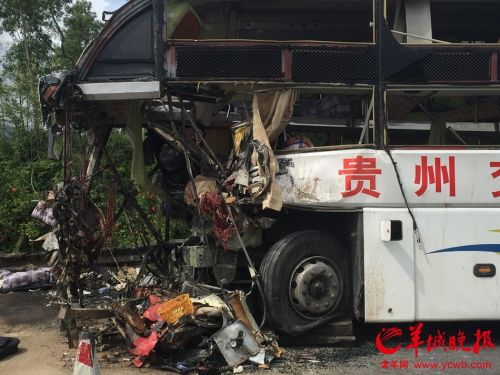 而在行走1個小時后,羊城晚報(bào)記者到達(dá)了事故現(xiàn)場,此時,5臺警車正在維持秩序,1臺消防車正在開展后續(xù)工作,而受傷人員皆已被送往醫(yī)院治療。記者在現(xiàn)場看到,被撞客車來自貴州交運(yùn)集團(tuán),在與裝有鋼筋的貨車相撞后,頭部毀壞嚴(yán)重,而車上乘客的私人用品都灑落在地上,一片狼藉。此外,裝有鋼筋的貨車被分成幾段,分別放在拖車上,而大批鋼筋都倒在路邊草叢中。“我趕到的時候,客車?yán)锶茄?,左邊玻璃還全被震碎了,里面的人被武警官兵抬到路邊,不過客車司機(jī)好像當(dāng)場就死了,好慘。”正在現(xiàn)場清理的高速環(huán)衛(wèi)工人告訴記者,上午11點(diǎn)多,在接到事故通知后,他們第一時間來到了現(xiàn)場,而當(dāng)時場面十分慘烈。“鋼筋插到客車駕駛座位置,你想想,得有多嚴(yán)重。”