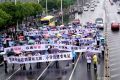 2015-05-30 17:26 來源:光明網(wǎng)5月29日,安徽省合肥市,上午10點(diǎn)左右,經(jīng)開區(qū)禹州天境小區(qū)100多名業(yè)主因反對小區(qū)附近建設(shè)變電站,在金寨路與繁華大道交口拉橫幅攔路維權(quán),隨后與警察發(fā)生沖突。