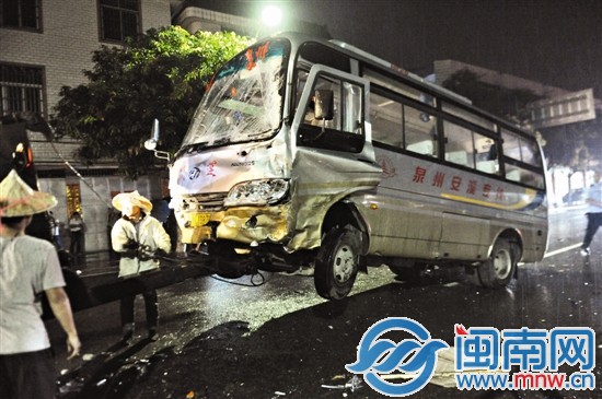 昨晚7點(diǎn)多,海都記者第一時(shí)間趕到現(xiàn)場。事發(fā)路段是雙向6車道,路中央有5截護(hù)欄被撞沒。泉州往安溪方向的車道上,一輛閩CT33××的出租車,橫在路中,車的右側(cè)部位和車頭嚴(yán)重變形。一輛閩CY38×ד泉州—安溪”的中巴車,車頭對著出租車,前窗玻璃開裂嚴(yán)重,車頭下盤和駕駛室被撞凹。