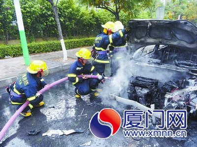 邊防民警拉起警戒線,消防員用水槍進(jìn)行滅火。5分鐘后,大火被撲滅。為防止發(fā)生復(fù)燃,消防員打開(kāi)引擎蓋,用水槍對(duì)引擎器進(jìn)行降溫處理。引擎蓋一打開(kāi),情景實(shí)在慘不忍睹,鐵蓋下黑糊糊一片,有些零部件都燒沒(méi)了。車(chē)屁股保住了,但車(chē)頭和車(chē)內(nèi)都被燒得面目全非。