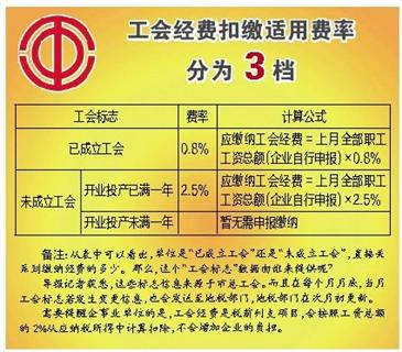據(jù)了解,工會(huì)經(jīng)費(fèi)采用“自行申報(bào)”,而非“強(qiáng)制扣繳”。企事業(yè)單位每個(gè)月的15日前如實(shí)按期申報(bào)繳費(fèi)基數(shù)——即上月全部職工工資總額以及對(duì)應(yīng)的職工人數(shù)。地稅部門(mén)根據(jù)這些信息,按照適用費(fèi)率產(chǎn)生應(yīng)繳金額進(jìn)行扣繳,費(fèi)率共分為三檔。